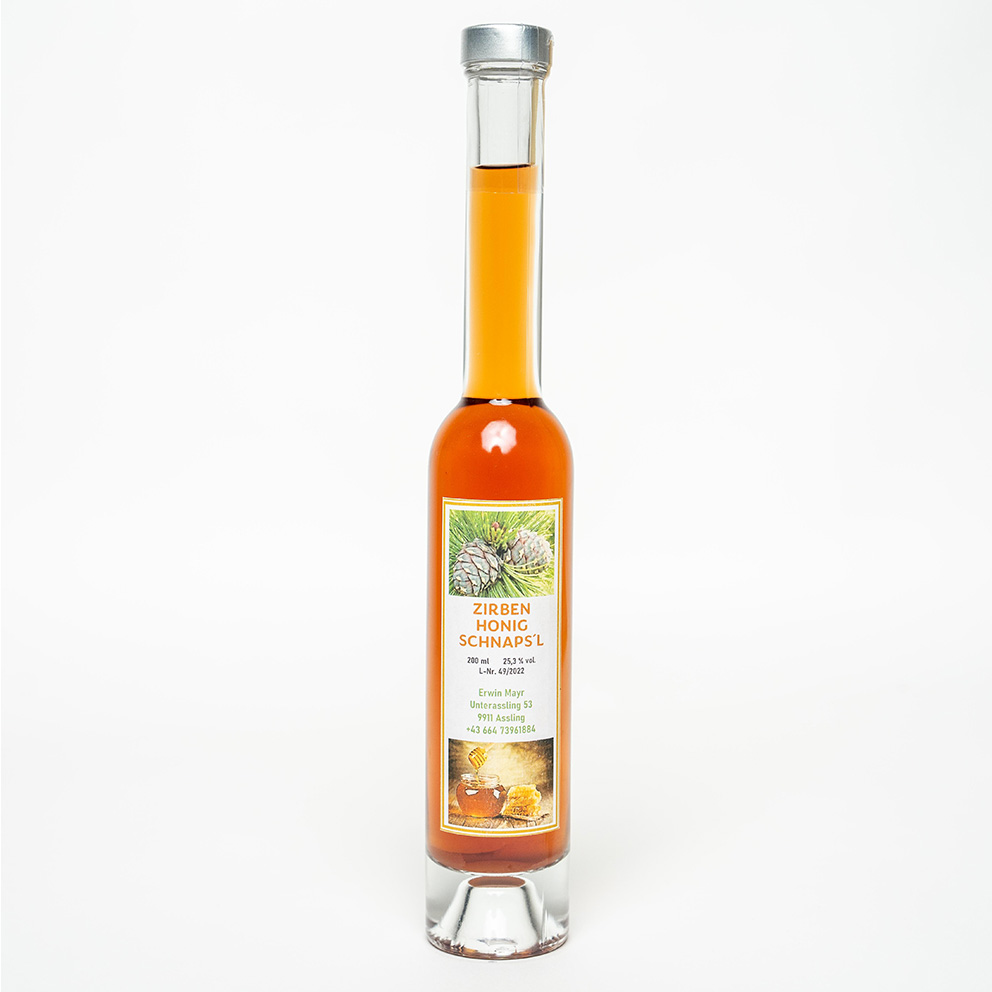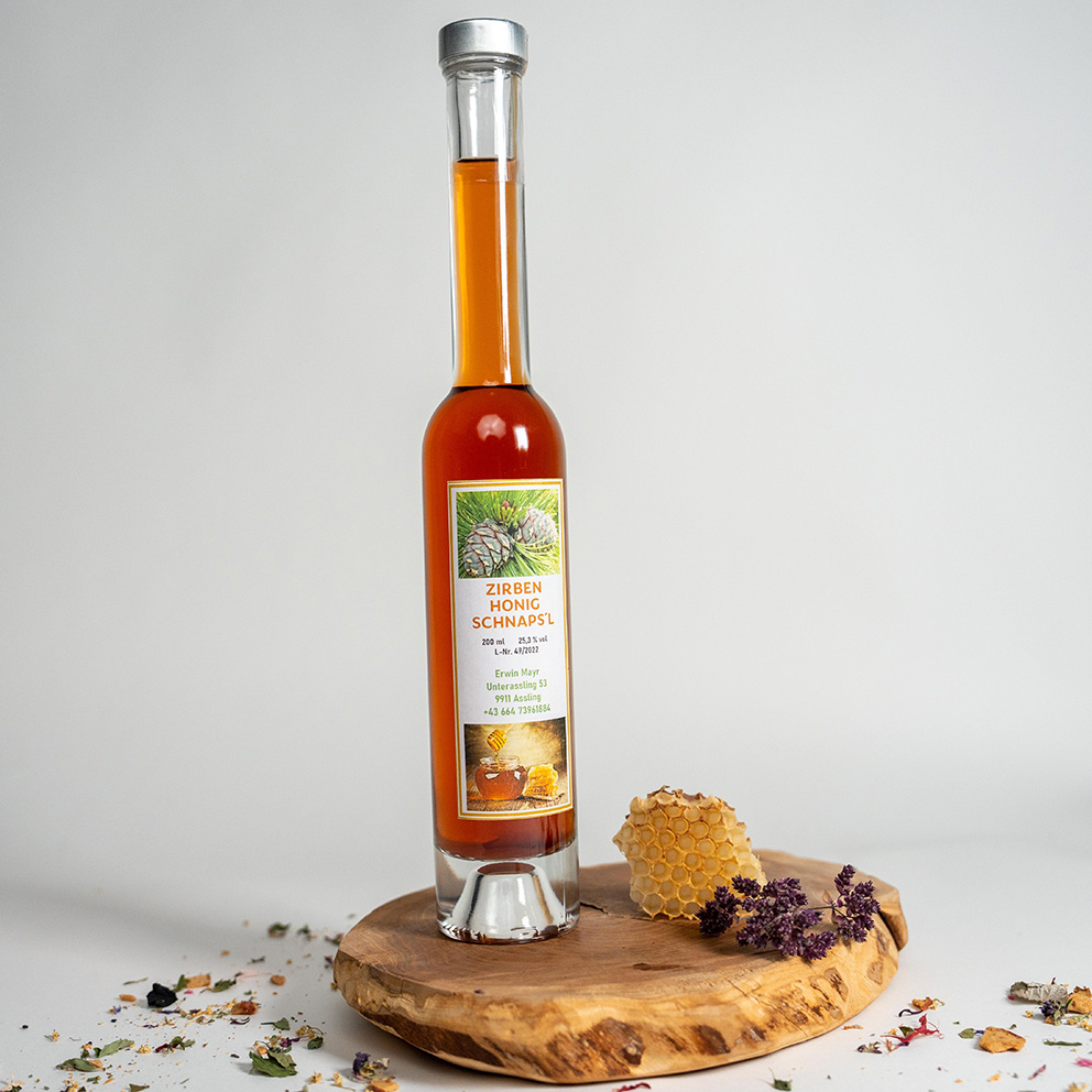 Der einzigartige Geschmack der Zirbe, gewonnen aus den Zirbenzapfen, angesetzt in Alkohol und mit Honig verfeinert, steckt in unserem Zirben-Honig-Schnaps’l. Der Likör überzeugt durch seinen milden, charakteristischen Geschmack und ist nicht nur ein Genuss, sondern auch eine Wohltat für Körper und Seele.
